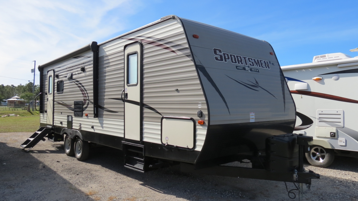 Front Queen Bed, Rear Bath, Side Kitchen, Side Sofa pulls out to a bed, TV, Stereo, Roof Air, 2 Burner Cooktop, Microwave, Refrigerator, Power Awning, Spare Tire, Power Tongue Jack Approx weight: 3,071