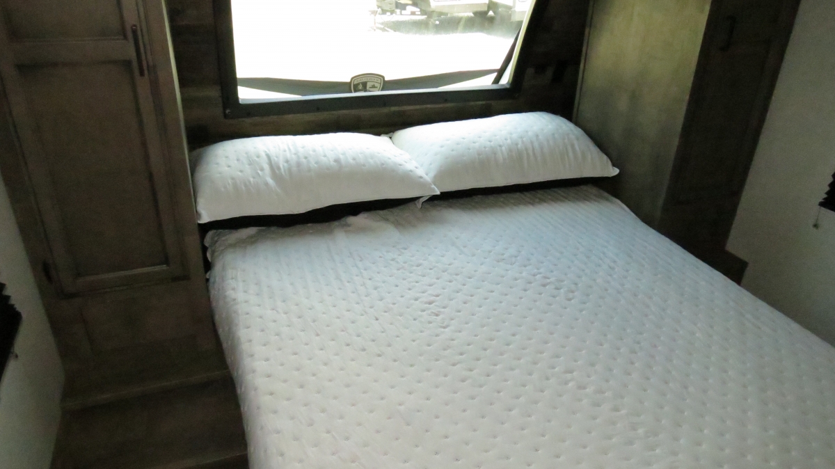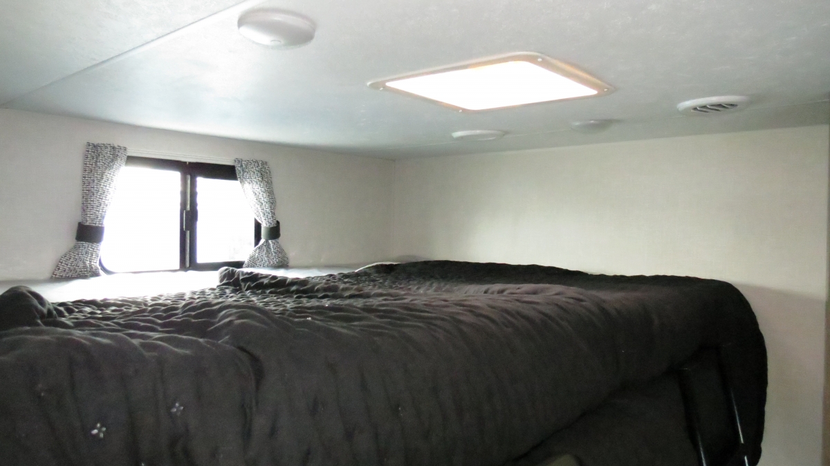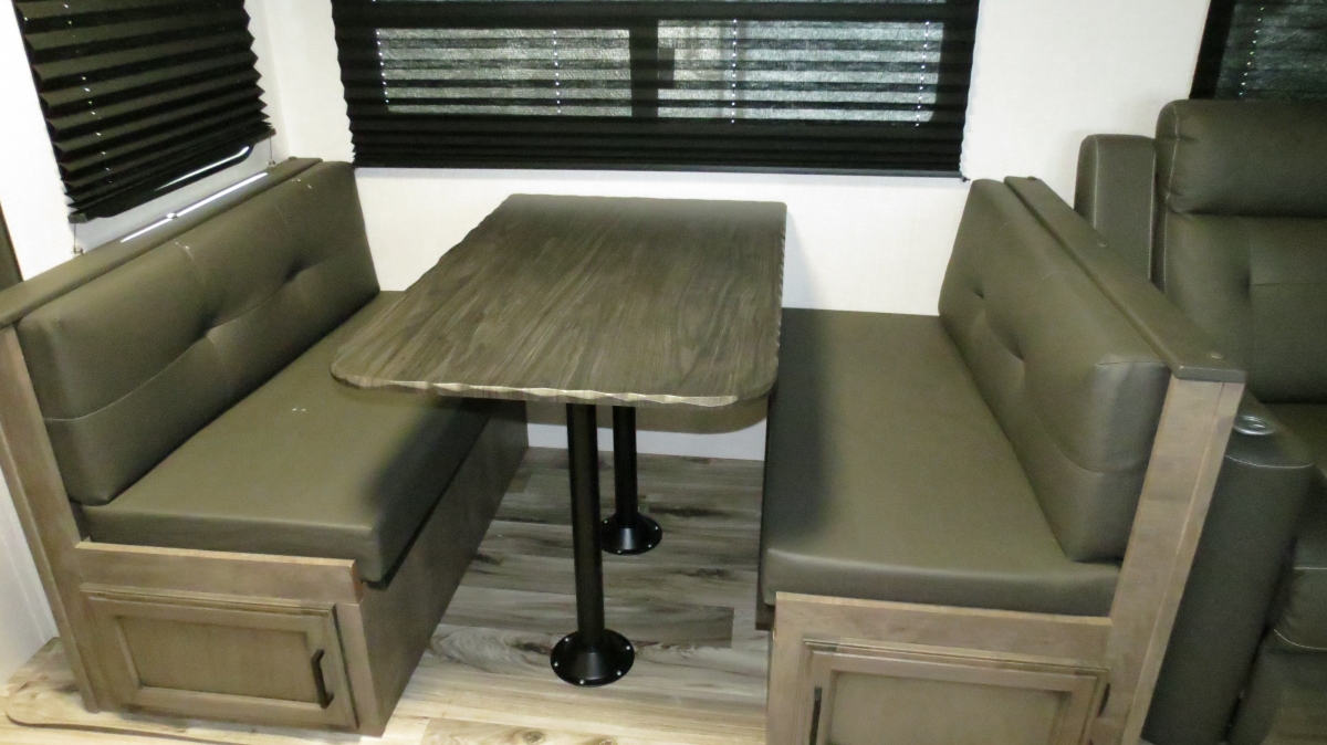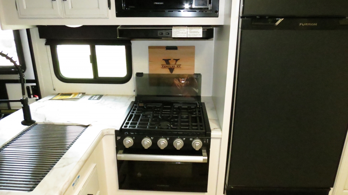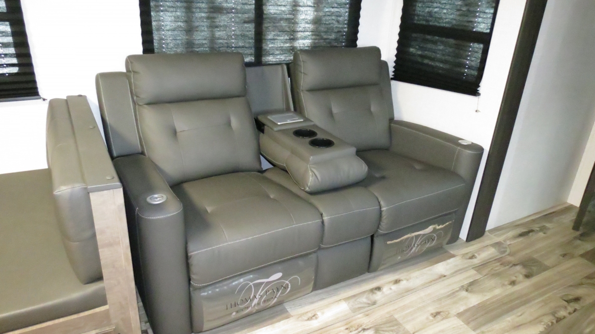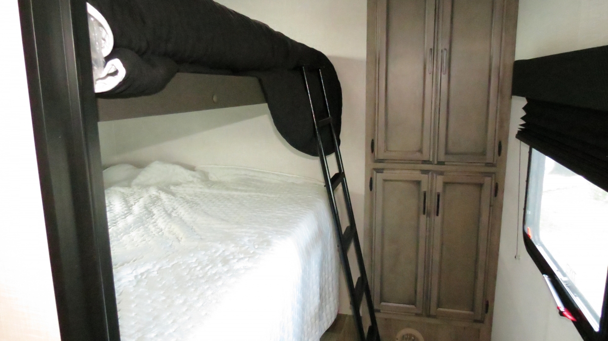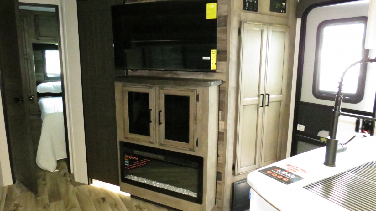 Front Queen Bed, Side Bath, Dinette Slide w/Theater Seats, Side Kitchen, Rear Queen Bunk Beds, Fireplace, TV, Stereo, 15K Ducted AC, 2nd AC in Bedroom, 3-Burner Range, Oven, Micro, 12V Refrig., Pantry, Pwr Awning, Ext Speakers, 4 Stab Jacks, Rear Ladder, Hitch, Ext. Shower, Dual LP Tanks, Pwr Tongue Jack, Outside Cook Center w/ Griddle, Sink & Mini Fridge. Approx Weight: 7,220