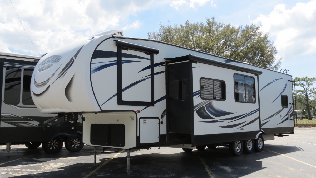 Front Queen Slide, Side Bath, Kitchen Slide w/3 Burner Range--Oven--Microwave--Refrigerator, TV & Stereo, Large L Shape Sofa Slide w/Table, Loft Bed, Rear Cargo w/Ramp Door, Screen Wall, Power Bed, Power Sit 'n Sleep, Sink, 2 Bar Stools, Power Awning, Rear/Side Ladder, Generator, Fuel Fill Station. Approx weight: 15,745